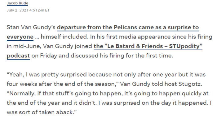 JRS直播网讯 大范甘迪执教鹈鹕一个赛季就被炒鱿鱼,对于大范来说确实是一个羞愧难当之事,去年还被鹈鹕高级别接待,一个赛季之后鹈鹕没有打出优秀战绩,就这样被炒鱿鱼,鹈鹕还说是共同决定,但大范或许不满被鹈鹕炒鱿鱼,他应该还是渴望继续留队执教,所以在《STUpodity》节目上谈到自己被炒鱿鱼的原因,大范表示并非共同决定,关键原因是他与鹈鹕总裁格里芬出现巨大分歧,导致了大范被迫离开鹈鹕。