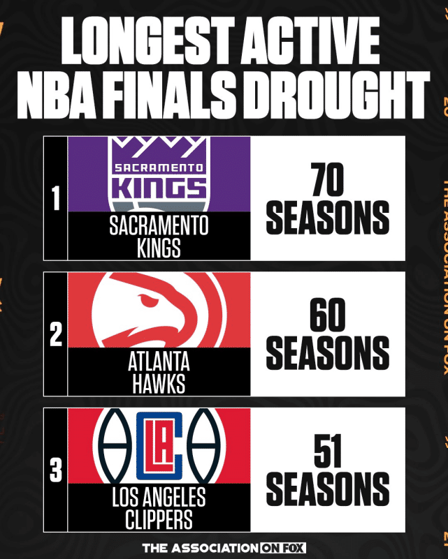 数据显示,国王在50-51赛季夺冠后,再也没有染指NBA总决赛。在当年和湖人西部争雄时,国王曾经有进入总决赛的机会,但罗伯特·霍里扼杀了他们的希望。如今,国王已经完全沦为鱼腩。莫说总决赛,连季后赛都是奢望。