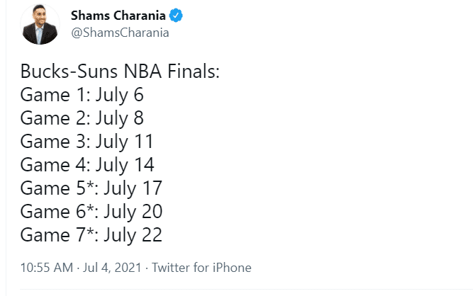 JRS直播网讯 北京时间7月4日,雄鹿118-107击败老鹰,以4-2的总比分晋级总决赛,他们的对手是菲尼克斯太阳队。总决赛的赛程也已经出炉,首战将在北京时间7月7日打响。