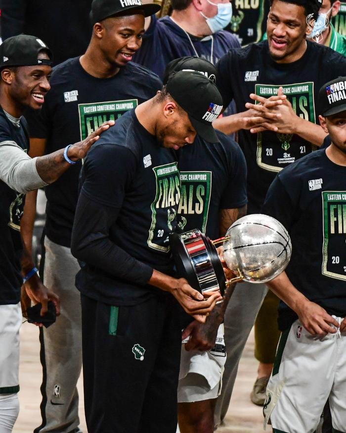在东部冠军颁奖仪式上,米德尔顿第一个捧起东部冠军奖杯,然后和全队一起狂欢庆祝,当时字母哥主动伸手向米德尔顿要奖杯,字母哥抱着奖杯并双眼紧紧盯着奖杯,这一刻他等了8年。