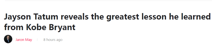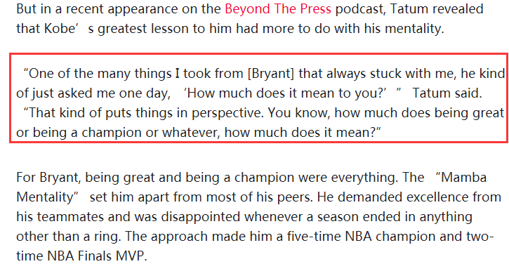 塔图姆同样回忆了曾经科比与他的对话,塔图姆说:“科比曾问我:‘这对你意味着什么?’他的意思是成为伟大的球员、成为总冠军,这件事对你而言有多大的意义。你愿意放弃什么,牺牲什么?这是科比的生存法则。”