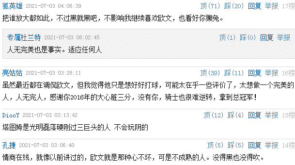 关于欧文的评价,塔图姆也引起了网友就“完美”的讨论,其实欧文对于自己的完美要求得过于苛刻,才让欧文进入到了舆论漩涡,甚至与队友出现了一些不该有的矛盾,尤其是一些不该说的话,欧文从来都是快口快言,这也一度引起了联盟第一人詹姆斯的厌恶。