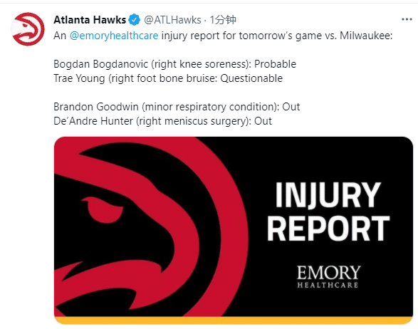 老鹰官方宣布,博格丹-博格达诺维斯(右膝酸痛)G6大概率出战(75%可能性),特雷-杨(右脚骨挫伤)出战成疑(50%可能性)。