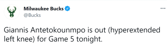 JRS直播网讯 北京时间7月2日,雄鹿官方宣布,字母哥因左膝过度伸展的伤势,将缺阵今日的天王山之战。老鹰一方,眼部发炎的卡佩拉已经确定可以出战,特雷-杨继续养伤,不会出战今天的比赛。