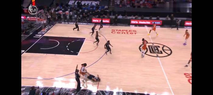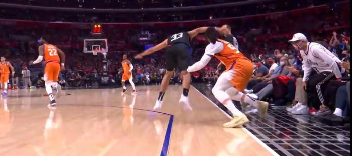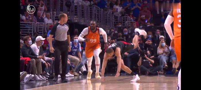 比赛来到第二节还剩下6分钟的时候,场上也发生了非常有争议的一幕。太阳队球员克劳德左侧底线三分,快船队球员巴图姆在扑防的时候有一定的犯规动作,可是裁判并没有吹罚。