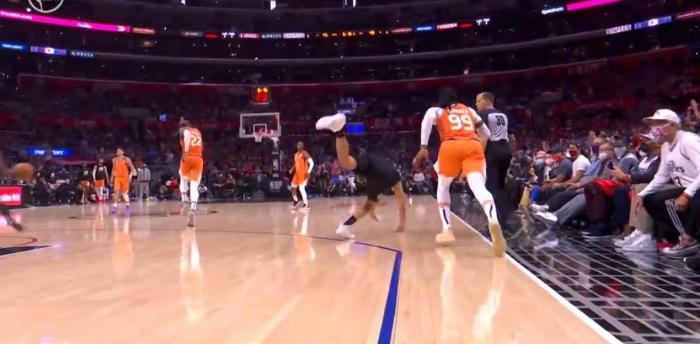 这次碰撞也让克劳德摔倒在地,随后巴图姆起身准备投入进攻的时候,起身的克劳德伸手捞了巴图姆的小腿,这也导致巴图姆直接摔倒在地。不得不说,克劳德的这个动作是非常不理智的,连技术中心的贾维也认为这是一个没有必要的、多余的动作,这个动作裁判应该给予一记恶意犯规。