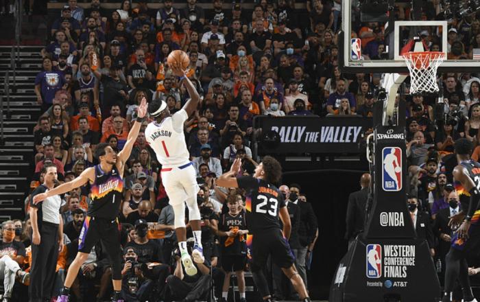 祖巴茨未能出战虽然打乱了泰伦-卢的轮转体系,不过他派出的五小阵容也确实收到了非常良好的效果,在很长一段时间里,太阳队都难以攻破快船队的联防体系,然而在攻守转换之中,雷吉-杰克逊无疑承担起了非常重要的角色。作为活塞队曾经的明星级后卫,雷吉-杰克逊已经在底特律证明过自己的实力,他的运球稳健、身体素质非常不错,具备着柔和的投射手感以及关键时刻一锤定音的大心脏,在今年季后赛的征程之中,雷吉-杰克逊再一次向我们展示出来了他的强大之处,季后赛进行至今,雷吉场均能够得到18.1分3.1个篮板以及3.2次助攻的全面数据,值得一提的是,雷吉-杰克逊在三分线外的命中率更是高达41.5%。