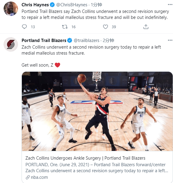 开拓者官方已经宣布,扎克-科林斯第二次接受左脚应力性骨折修复手术,因伤无限期休战,短短10个月内,科林斯已经三次接受手术,合同年接连遭遇重伤太不幸。