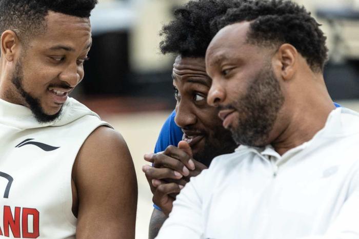 比卢普斯首次以主教练的身份亮相,对着镜头满脸笑容十分开心,开拓者球星CJ-麦科勒姆来到现场力挺新帅,与比卢普斯面对面聊起来,考文顿也来了,他们两人都是穿着拖鞋。