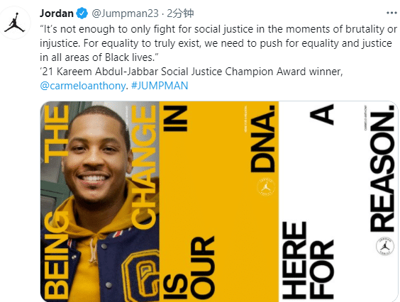 乔丹官推晒照,并且发推:仅在残暴或不公正的时刻为社会正义而战是不够的;为了让平等真正存在,我们需要在黑人生活的所有领域推动平等和正义。