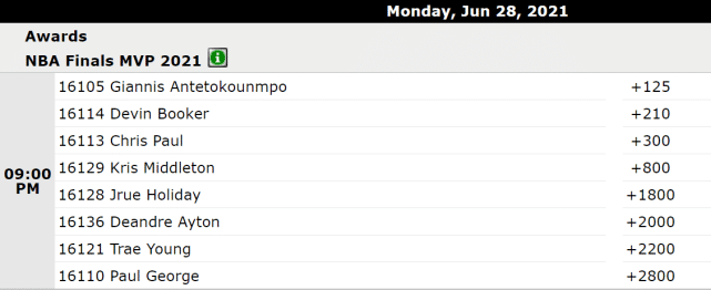 JRS直播网讯 北京时间6月29日,总决赛MVP(FMVP)的赔率更新。东决2-1领先的字母哥,依然排名第一。和四天前相比,他的领先优势更大了。布克和保罗依然分列二三位,雄鹿vs太阳是今年总决赛最被看好的对阵。在东决G3迎来爆发的米德尔顿,也从四天前的第七升至目前的第四。