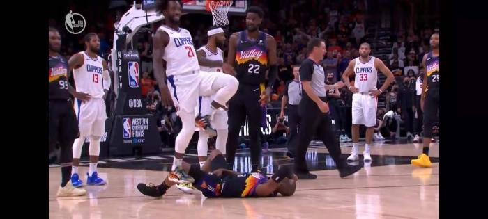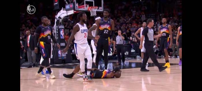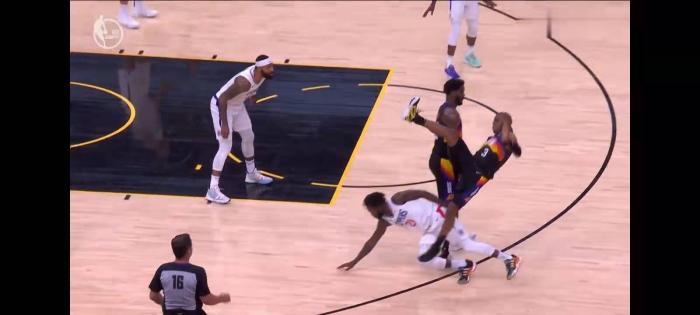 比赛来到第三节还剩下4分多钟,保罗借助掩护,准备上演干拔三分,此时的贝弗利积极地抢过,争议的一幕来了,贝弗利一个钻身下的动作让保罗直接在空中失去重心,摔得人仰马翻。倒地之后的保罗也是久久不能起身,甚至一度捂着小保罗,让太阳队球迷看得心惊胆战。