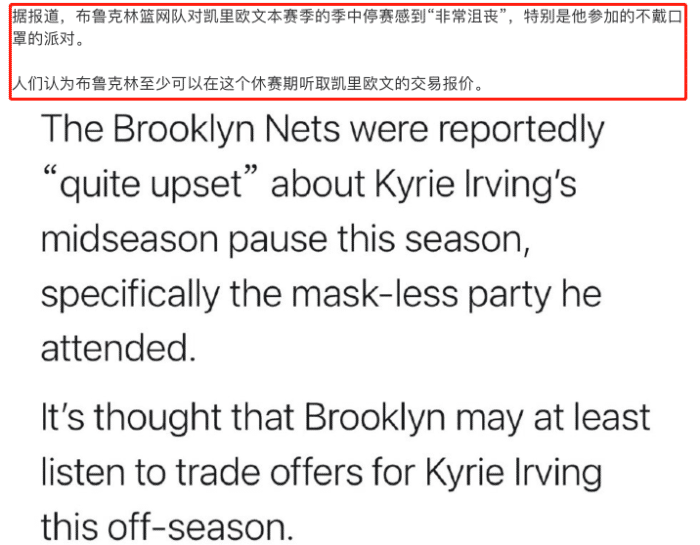 而篮网提前钓鱼之后,欧文深陷交易流言之中。据美媒报道,篮网可能在休赛期听取欧文的报价。欧文在常规赛期间被停赛,篮网对此感到沮丧,而且,他没有戴口罩就参加派对,更是让球队不满。