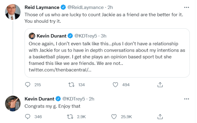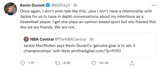 杜兰特转发了麦克穆兰的言论,写道:“再说一次,我根本不会像这样说话……我和杰基(麦克穆兰)还没有熟到深入谈论我作为一个篮球运动员的目标……她说得就好像我们是朋友一样,但我们并不是。”