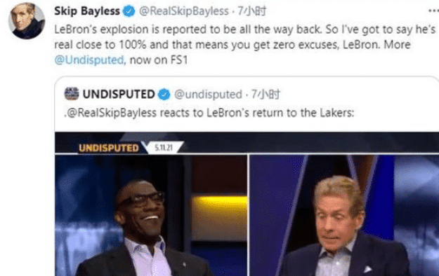 6月25日,Skip在社交媒体上谈到快船在西部决赛G3中对阵太阳,这场比赛期间,Skip就隔空谈到了詹姆斯,他表示:“斯台普斯球馆在6月的一场重要季后赛没有勒布朗也没有湖人队,有人知道勒布朗怎么了吗?”