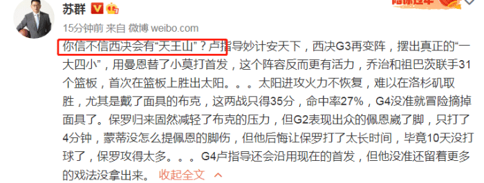 赛后,国内篮球名嘴苏群谈到了西决G3,苏群老师倒戈了,他认为这轮系列赛还有悬念,甚至有天王山。此前,苏群老师在社媒上和球迷互动,他表示快船想赢,除非莱昂纳德复出,现在来看,没有小卡的快船,也能击败太阳。