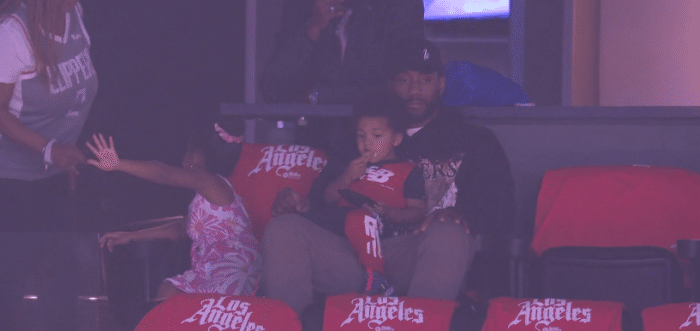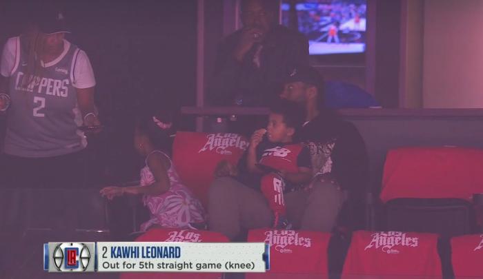 快船首节29-21领先太阳8分,期间镜头给到小卡,快船领袖并没有坐在替补席,而是坐在斯台普斯球馆的包厢里,和老婆孩子一起看比赛,小卡抱着孩子看比赛,身穿黑色连帽卫衣、戴着棒球帽十分低调,面无表情;自从西部半决赛G4受伤之后,小卡已经因伤连续缺席5场比赛。