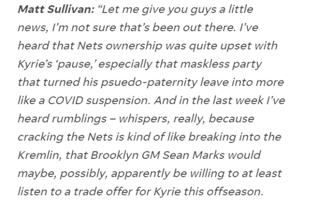 JRS直播网讯 昨日23日,据NBA记者Matt Sullivan报道,欧文在这个赛季的一些做法,惹恼了篮网高层的一些成员,这导致欧文在今年夏天有被交易的可能性。