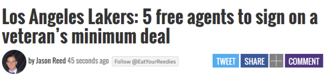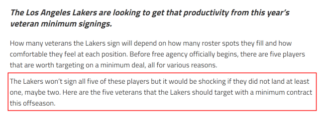 JRS直播网讯 季后赛首轮出局,湖人势必需要补强阵容。不过,受限于薪金空间,老将底薪合同将是佩林卡在休赛期的主要签约模式。北京时间6月24日,洛城媒体Lakeshowlife列出了五大底薪签约的目标,并指出湖人不会签下所有这五位球员,但如果他们没有至少签下其中一两位,那将是令人惊讶的。
