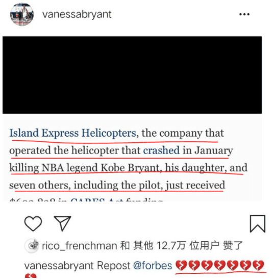 2020年6月21日,岛屿快线直升机公司获得了603838美金的资助,用来抗击疫情,当时瓦妮莎发文,转发报道,并且用了8个心碎的表情,意思很明显,就是一个安全保障做得很不到位的公司,却得到资金支持。