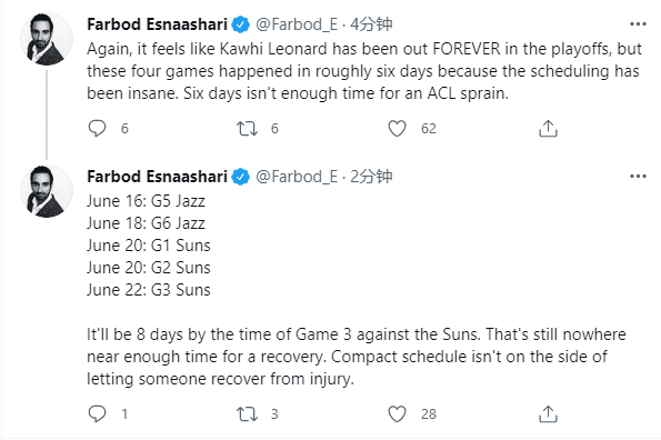 算上西决第三场,小卡因膝盖伤势已经连续缺席5场比赛,期间乔治带队淘汰爵士,但西决前两场都遗憾输球;小卡膝盖伤势有多严重?快船一直没有对外公布具体的伤情,但快船记者Farbod Esnaashari发推写道:由于赛程太紧凑,只有8天是不够小卡(十字韧带扭伤)养伤的。