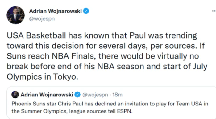 之前有消息显示,保罗答应出战奥运会,不过最新消息表明,保罗已经婉拒了邀请,不会出战奥运会。雄鹿的米德尔顿、霍勒迪和骑士的乐福愿意出战奥运会,现在愿意出战奥运的球员达到11人,分别是杜兰特、哈登、利拉德、比尔、塔图姆、阿德巴约、格林、布克、米德尔顿、霍勒迪和乐福,如果选择12人名单,还差一人,乔治可能会是最后一个答案,但还要看季后赛的进程。