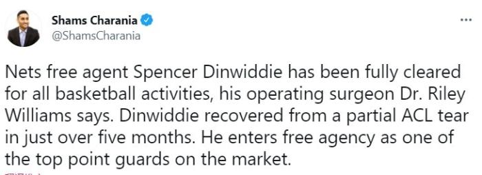 据名记Shams报道,丁威迪的外科医生莱利-威廉姆斯表示,丁威迪已获准参加所有篮球活动。Shams表示“丁威迪仅用5个月就从十字韧带部分撕裂的伤势中康复,他会成为今夏自由球员市场中的顶级控卫。”莱利-威廉姆斯表示:“丁威迪无论是感觉还是动作都和受伤前无异。”
