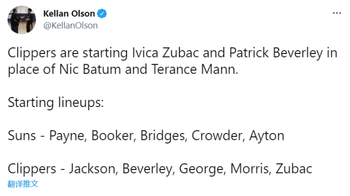 相比于首场比赛,太阳方面没有任何变化。但快船方面做出了重要调整!巴图姆和曼恩被拿下首发,贝弗利和祖巴茨进入首发阵容。在系列赛第二场就进行变阵,泰伦卢已经轻车熟路。贝这套首发阵容的后卫线防守和内线护框能力都更强,显然卢指导对于首战的输球做出了针对性部署!