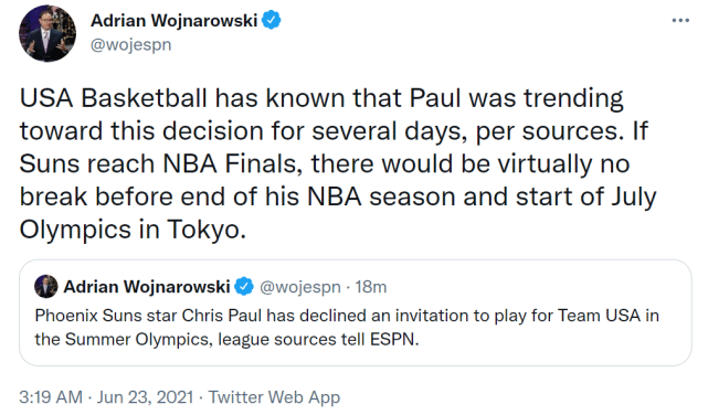 JRS直播网讯 北京时间6月23日,据名记沃纳罗斯基报道,太阳球星克里斯-保罗已经拒绝了美国男篮的邀请,将不会参加今年夏天的东京奥运会。如果太阳打进总决赛,保罗的体能会受到严峻的考验,因为NBA赛季结束和奥运会开始之间没有休整的时间。