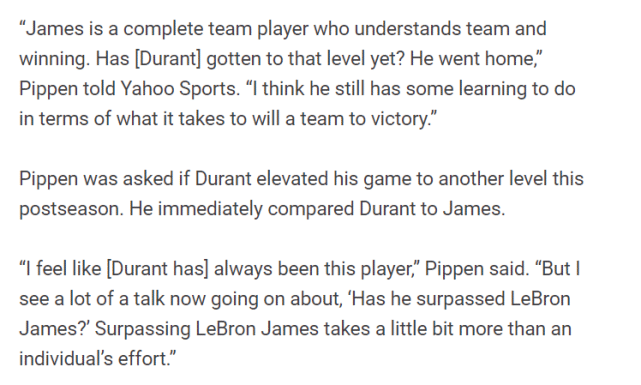 主持人询问皮蓬,到了季后赛,杜兰特是否将他的比赛提升到了另一个水准。“我觉得杜兰特一直都是这样的球员,”皮蓬说道,“但我看到了很多关于‘他是否已经超越勒布朗-詹姆斯’的讨论,超越勒布朗,需要的不仅仅是个人的努力。”