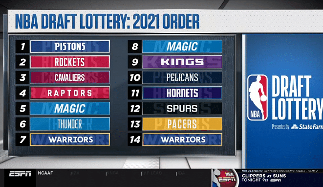 JRS直播网讯 6月23日,NBA选秀大会乐透抽签举行,最终活塞拿下状元签,而常规赛倒数第一的火箭拿下榜眼,骑士探花签位,猛龙等队分居后面。值得一提的是森林狼获得第7顺位,在此前交易中已经给到了勇士,所以勇士获得了第7和第14两个签位。