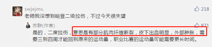 “二级拉伤,就是有部分肌肉纤维断裂,皮下出血明显,外部肿胀,需要三到四周才能回到原来的运动量,职业比赛的运动员可能需要更长时间”。
