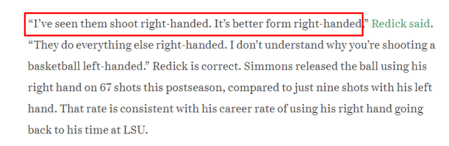 “我见过他们用右手投篮,他们用右手投射的手型更好,”雷迪克说道,“他们都是用右手做其他的事情,我不明白为什么要用左手去投篮。”数据显示,西蒙斯在今年季后赛有67次出手是右手,而左手的出手只有9次。他在训练和比赛时大都用左手去投篮,但总会不由自主地用右手去勾手、上篮、抛投。