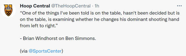 美媒The Ringer认为如果西蒙斯能开发出一手稳定的投篮,他就能成为现代版的皮蓬,甚至是现代版的魔术师。这就是关键所在。他们指出,虽然换一下惯用手未必奏效,但试试总没有坏处。作为一名左手投篮的球员,西蒙斯的表现不能再差了,在比赛中,他甚至已经不敢正常投篮了。