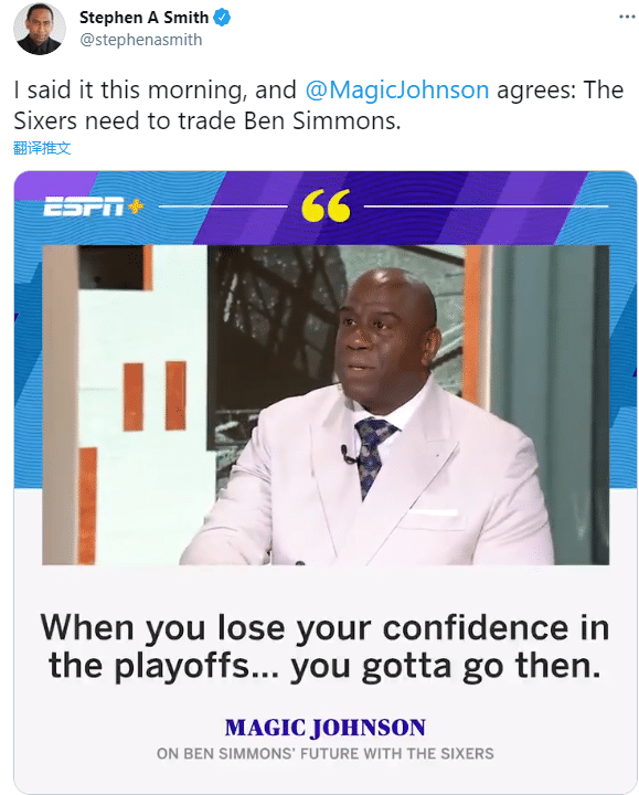 JRS直播网讯 名嘴“美国杨毅”直言本-西蒙斯必须离队,湖人名宿魔术师同意A-史密斯的观点,直言:当你在季后赛失去信心时,你就必须走了;魔术师认为76人需要交易西蒙斯。