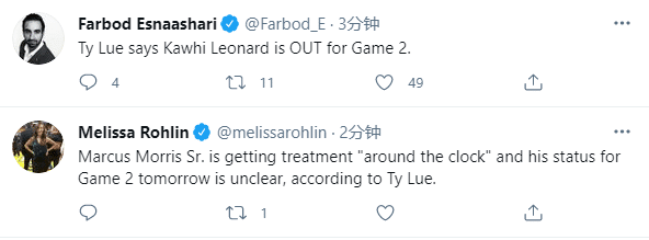 快船远赴客场挑战太阳,小卡因伤留在洛杉矶接受治疗,因伤连续缺席西决G1和G2;不过伤停期间,小卡仍旧心系球队,和队友发短信以及远程指导球队,如此操作和保罗一样,因为保罗也是这样做的,至于保罗能否出战G2,暂不清楚,不过确诊后他一直没有出现症状,预计很快能够复出。