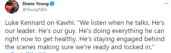 对于小卡,快船球员肯纳德表示:当他说话时,我们都会认真倾听,他是我们的领袖;他现在正在尽其所能恢复健康。他在幕后参与进来,确保我们时候准备好并专注于比赛。
