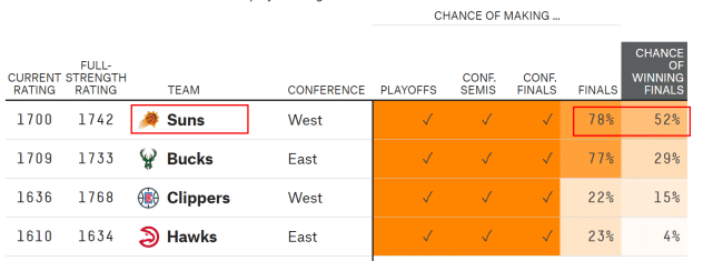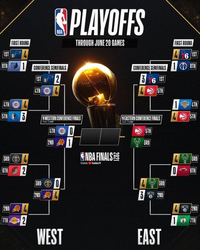 JRS直播网讯 北京时间6月21日,太阳120-114主场击败快船,拿下西决首胜。布克40分13篮板11助攻,拿下生涯第一次三双。老鹰103-96击败费城,和雄鹿会师东部决赛。赛后数据网站FiveThirtyEight第一时间更新了夺冠概率。太阳成为最被看好的球队。