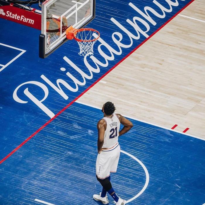 恩比德晒出站在禁区看篮筐的赛场照,发推写道:费城我爱你!