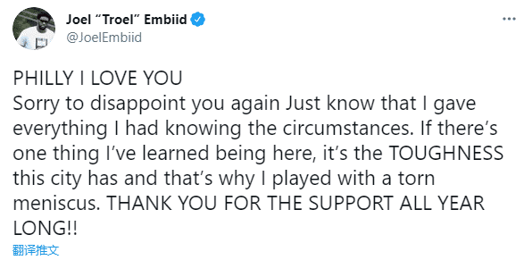 很抱歉再次让你失望,我知道我付出了我所拥有的一切。如果说我在这里学到了什么的话,那就是这座城市的坚韧,这就是为什么我半月板撕裂仍旧打比赛的原因,感谢您一年来的支持!!