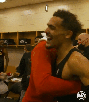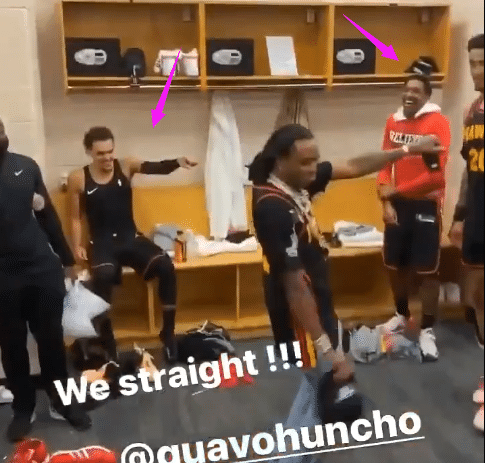 说唱歌星Quavo来到老鹰更衣室助兴,边唱边跳再次点燃更衣室,老鹰众球员跟着跳起来,其中特雷杨坐着模仿,路威咧嘴大笑早已笑得合不拢嘴。