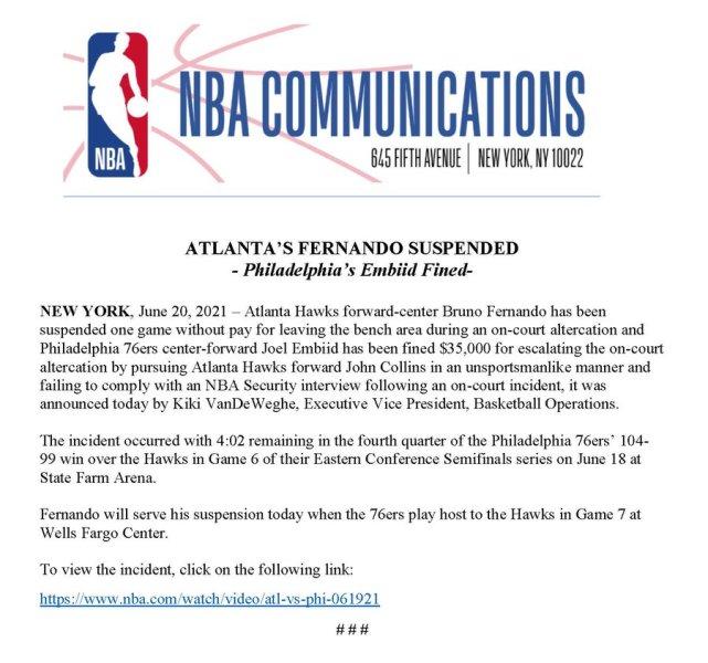 JRS直播网讯 北京时间6月21日,NBA官方宣布,在东部半决赛的第6场比赛中,费城中锋乔尔-恩比德因为升级了和老鹰前锋科林斯的冲突,遭到35000美元的罚款。