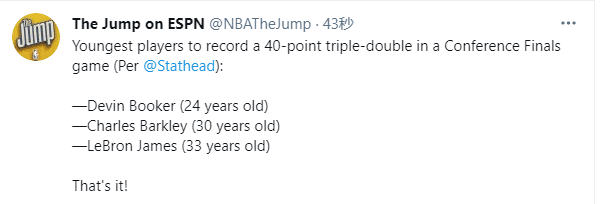 在保罗缺阵的情况下,布克第三节突然大爆发,各种中投像极了科比,末节贡献11分以及最后20秒连得4分杀死比赛;布克狂砍40+三双刷爆多项历史纪录,其中有一项神迹是布克成为NBA历史最年轻分区决赛40+三双球员。