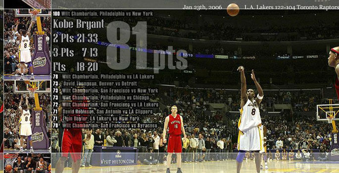2005年12月20日,斯台普斯中心,湖人VS小牛,科比化身洛城电锯杀人狂,手起刀落刀刀见红,仅用3节时间就劈落62分。令人瞠目结舌的是,此时科比的个人得分比小牛全队还要多1分,第3节最为血腥,他独取30分缔造了新的队史单节得分纪录。湖人最多时领先35分,得分得到手抽筋的科比第4节已无必要登场,于是很多人发出疑问:若科比再打12分钟,究竟能得多少分?科比很快给出了答案:60+远不是他的极限。2006年1月22日,还是这块场地,湖人VS猛龙,这一次有所不同,湖人没有压着对手打,恰恰相反,第三节开始时,猛龙领先了18分之多。英雄的登场总是需要这种情境铺陈,NBA历史上最伟大的个人表演之一上演了,只见那科比青筋绽出双眼放光,使出十八般武艺,左闯右突东打西杀,要雨得雨要风得风,竟在下半场砍落55分,全场轰下天文数字般的81分,湖人122:104逆转取胜。半场55分和全场81分,都在泱泱NBA史上高垂第二——张伯伦曾在1962年完成过半场59分和全场100分神迹。