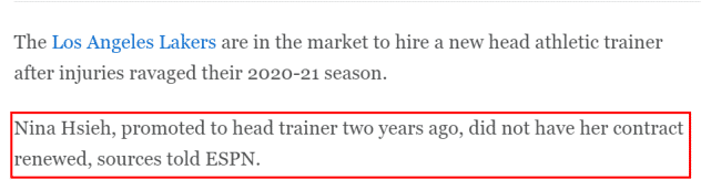ESPN报道称,这是湖人过去三年第二次和首席训练师分道扬镳。2018-19赛季,湖人球员累计因伤缺席212场比赛,赛季结束后,湖人和当时的首席训练师马克-努内斯分手,而在努内斯之前,加里-维蒂在这个岗位上工作了30多年。