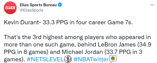 JRS直播网讯 北京时间6月20日上午8点30分,篮网和雄鹿将打响系列赛第七战,竞争晋级东决的名额。欧文缺阵,哈登还未100%恢复,凯文-杜兰特自然成为了篮网的焦点。赛前,EliasSports数据显示,杜兰特生涯G7场均得分达到33.3分(4场),在所有不止一次参加G7比赛的球员里,排名历史第三位。
