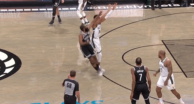 JRS直播网讯 垫脚,又是垫脚,字母哥在篮网队对阵雄鹿队的东部半决赛系列赛中交出的不是亮眼的数据,而是接连的两次垫脚。