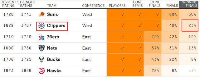 目前最新的夺冠概率榜上,快船以23%排名第二,不如太阳(36%),但高于费城(19%)和篮网(13%)。大家觉得快船能拿到今年的总冠军吗?欢迎留言发表见解。