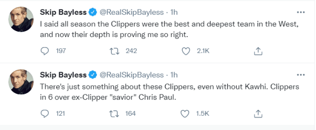 “我说了一整个赛季,快船是西部实力最强,阵容深度最好的球队,现在,他们的深度证明了我太对了。”贝勒斯说道,“这些快船球员是有真正实力的,即便没有科怀(莱昂纳德)。他们将以用6场比赛(4-2)淘汰昔日的快船‘救世主’克里斯-保罗。”