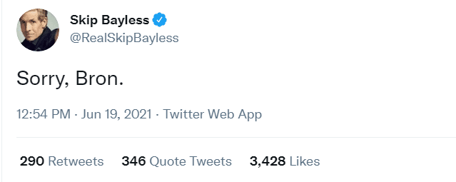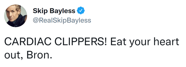 JRS直播网讯 北京时间6月19日,快船131-119击败爵士,以4-2的总比分淘汰对手,51年队史首次晋级分区决赛。名嘴斯基普-贝勒斯是知名“詹黑”,也是一个多年的快船球迷。看到自己喜欢的球队实现历史突破,贝勒斯相当兴奋,连续更新社媒猛夸快船的同时,也没忘了讽刺一下詹姆斯。